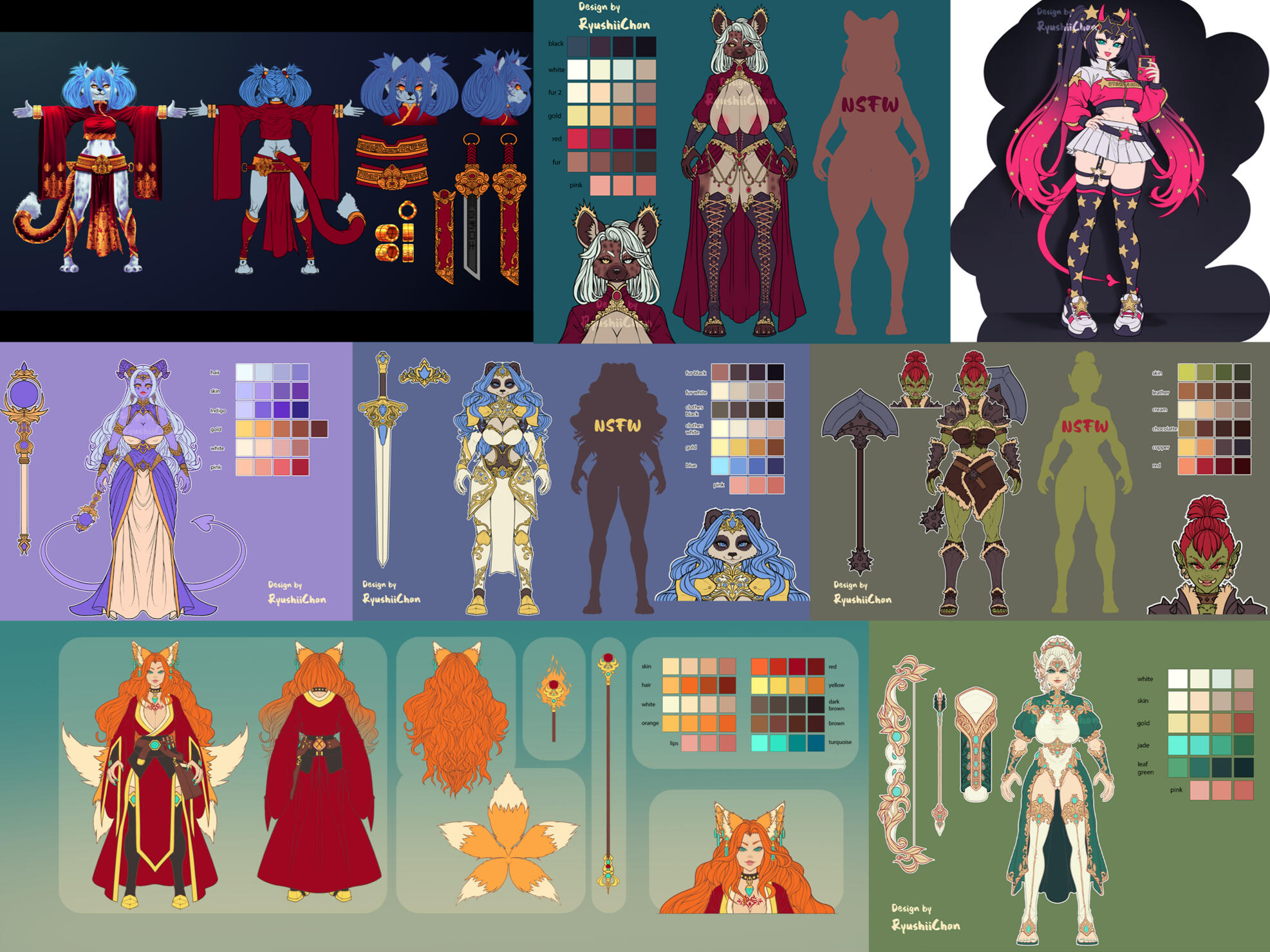 This section will also be updated, but for now the samples are of adoptables I have designed and sold. A character design reference sheet will be more complex and include different portrait poses with different expressions, other callouts such as closeups of certain parts or pulled out items from the design to be viewed fully from various sides (for example a bag the character wears, viewed separately from whatever angle is desired) or tattoos or clothes patterns/designs, chibi versions etc.Character Design/Redesign: 120€